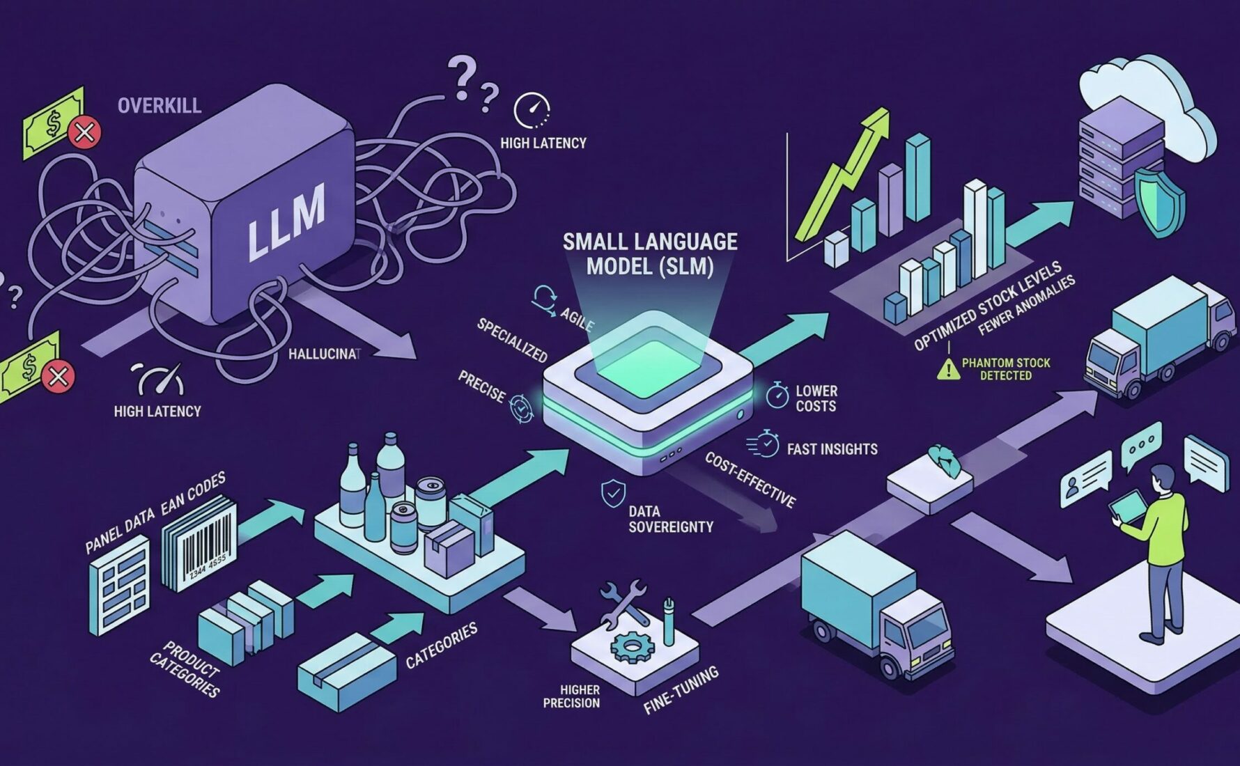 L’enthousiasme initial pour les modèles de langage massifs a souvent occulté une réalité technique majeure : la démesure algorithmique n’est pas synonyme de pertinence métier. Dans le secteur FMCG, les données de panel se caractérisent par une structure rigide, composée de codes EAN, de libellés produits abrégés et de hiérarchies de catégories complexes qui diffèrent d’un distributeur à l’autre. Utiliser un modèle entraîné sur l’intégralité du web pour classifier une nouvelle référence de boisson gazeuse revient à utiliser un marteau-piqueur pour enfoncer une épingle. La complexité interne des LLM génère souvent des hallucinations ou des approximations inacceptables lorsqu’une erreur de classification de 1 % peut entraîner des pertes sèches de plusieurs millions d’euros en stocks mal pilotés.