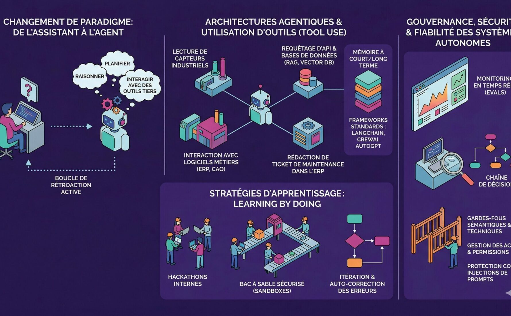 Enfin, la dimension éthique et sécuritaire constitue le dernier pilier indispensable de cette transformation. La formation doit impérativement intégrer des protocoles de contrôle et de monitoring pour encadrer l’autonomie des agents. Les ingénieurs doivent être capables de mettre en place des gardes-fous sémantiques et techniques pour éviter des actions imprévues qui pourraient impacter la chaîne logistique ou la sécurité des données sensibles. La réussite de ce projet de formation repose sur une culture de l’expérimentation continue, transformant chaque défi opérationnel en une opportunité d’automatisation intelligente et maîtrisée.